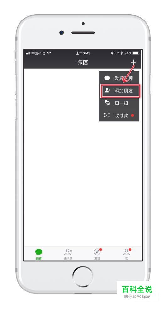 接着点击屏幕右上方的“+”并点击添加朋友,如下图所示。