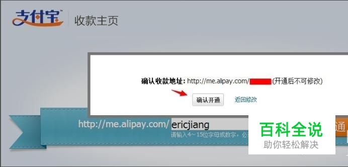 输入你要收款主页链接的名称。确认你的收款地址为:XXX。开通以后就不可以修改。确认之后就点击【确认开通】按钮