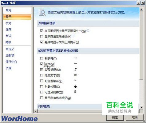 第2步,在打开的“Word选项”窗口中切换到“显示”选项卡,在“始终在屏幕中显示这些格式标记”区域选中或取消“空格”复选框,并单击“确定”按钮,如图2009021411所示。图2009021411 选中或取消“空格”复选框