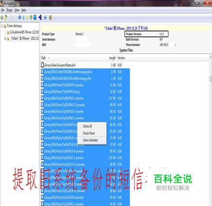 提取需要恢复的短信,选中根路径为Library/SMS/的所有文件(小贴士:点一下文件框上面的Path,文件会有序排列),然后右键“Check Selected”,选中的文件会打上钩。