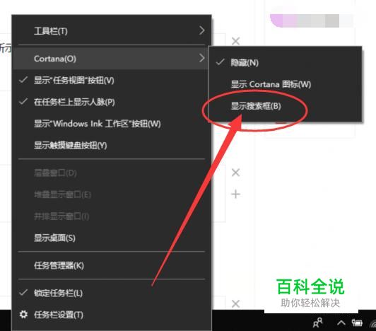 右击一下任务栏,然后点击“显示搜索框”,如图所示。