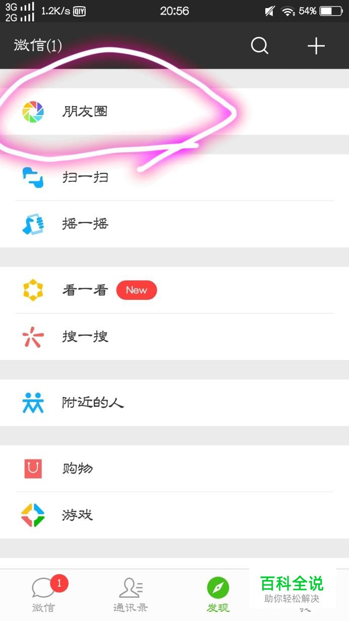 接下来,我们点击“发现”中的“朋友圈”我们可以分享生活的点滴,点击右上角的“拍摄”