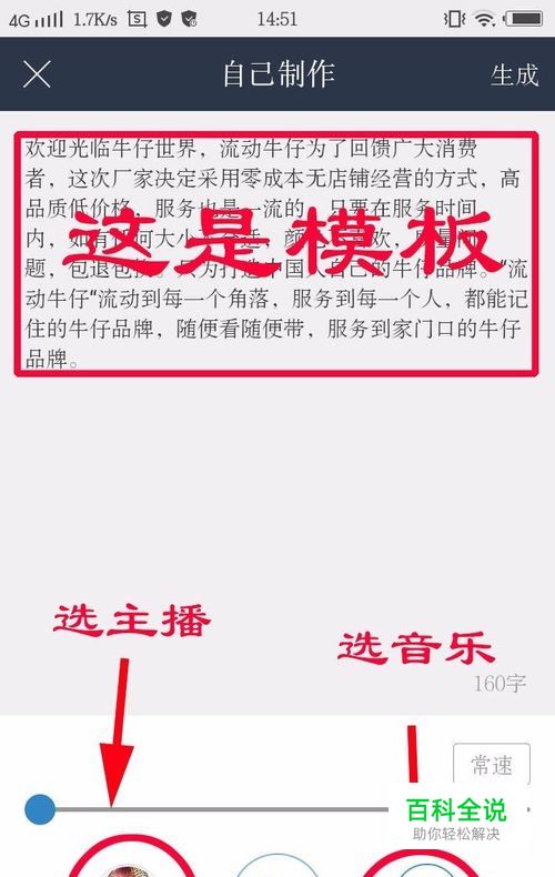在界面的下方找到“自己制作”摁钮并点击,出现一个“输入想要的文本”空白页。你可以自己编辑广告促销的文本,也可以参考里面的模版。我们将复制下来的摘要文本粘贴到此处的空白格。在进度条君的旁边还可以设置音速哦,一般常用的是“常速”啦,还可以在文本输入的过程中设置停顿,可以选择2秒,1秒或者0.5秒