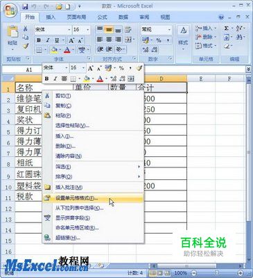 第1步,打开Excel2007工作簿窗口,选中需要设置字体的单元格。右键单击被选中的单元格,在打开的快捷菜单中选择“设置单元格格式”命令,如图2009060308所示。 图2009060308 选择“设置单元格格式”命令