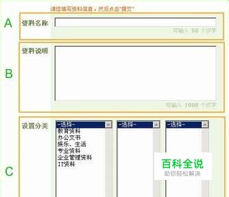 填写爱问资料信息 接下来,您进入到一个爱问共享资料详细设置页面,在这里您需要对爱问资料进行说明。 A: 填写资料名称:请填写您要上传的资料名例如:“电脑硬件维修手册”、“技术服务合同”等 B: 描述您的资料:请填写资料说明,向其他网友介绍您上传得资料 C: 设置爱问共享资料分类请为您要上传的资料设定分类,资料分类设置越详细,您的资料就越会 被更多的网友关注并下载。 D: 设定下在该资料所需积分这是资料每被下载1次,别人需要付给您的爱问共享积分, 如果您将资料无偿共享给别 人,用户每下载一次,我们将奖励你1个爱问积分。每条资料您最多只能获得 爱问积分30分