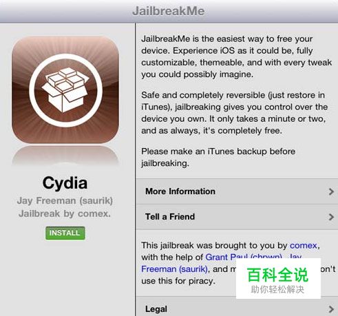 使用JailBreakMe 3.0越狱iPad2过程 友情提示:越狱前请提前备份SHSH以备不时只需,备份SHSH教程请参考:[最全的备份SHSH的几种方法]。目前越狱支持全系列设备的iOS 4.33版本,暂无解锁(2011-6-7),有锁版请自觉离开。 步骤如下: 1、升级到iOS 4.3.3之后,打开safari 2、输入http://www.jailbreakme.com之后,进入该页面 3、点击free,接着再点击install即可 4、这时,safari自动关闭,自动下载Cydia 此时,越狱工作完成。设备重启。 评价:确实很方便,连PC或者Mac都省下了。iPhone、iPad都是这个步骤。