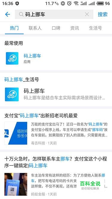 进入支付宝搜索应用界面,输入“码上挪车”进行搜索。