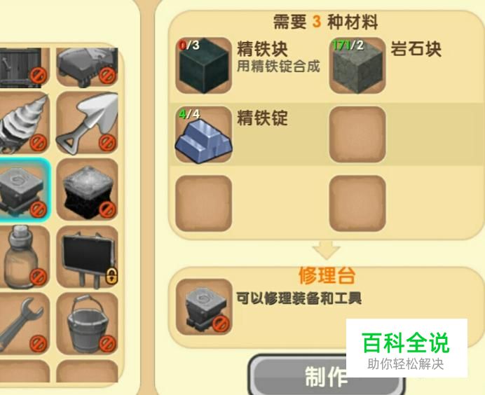 要想修理弓,我们首先需要制作修理台,制作修理台需要,3块精铁锭、3个精铁块、和2个岩石块。