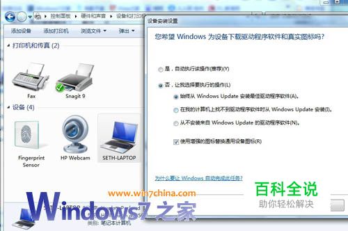 方法1: 1、打开控制面板>“查看设备和打印机”或者开始菜单里直接有“设备和打印机” 2、右键你的PC,就是你PC的图标,选择“设备安装设置” 3、在弹出来的窗口选择“否”> 第三项,从不安装即可!