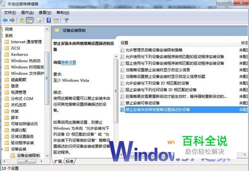具体操作: 1、点击开始菜单,输入gpedit.msc回车,或开始,运行,输入gpedit.msc 2、依次找到值——计算机配置>管理面板>系统>设备安装>设备安装限制 3、双击右侧的——禁止安装未由其他策略设置描述的设备,选择已启用 4、重启即可 强调一下,本文是是禁止自动安装驱动~,通过手动方式安装!而不是不安装驱动!