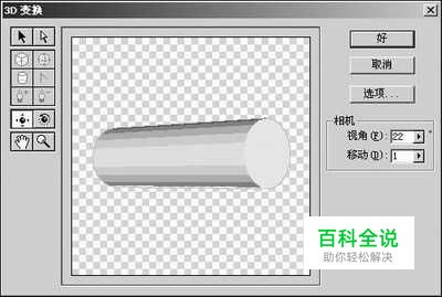 启动Photoshop CS,新建一个白色画布,再新建一个图层,执行“滤镜→渲染→3D变换”命令,打开“3D变换”对话框,在对话框左侧选择“圆柱”工具在预览窗口中拖动,绘制一个圆柱,然后使用轨迹球工具旋转模型,使模型产生立体效果作为笔杆,如图1所示。