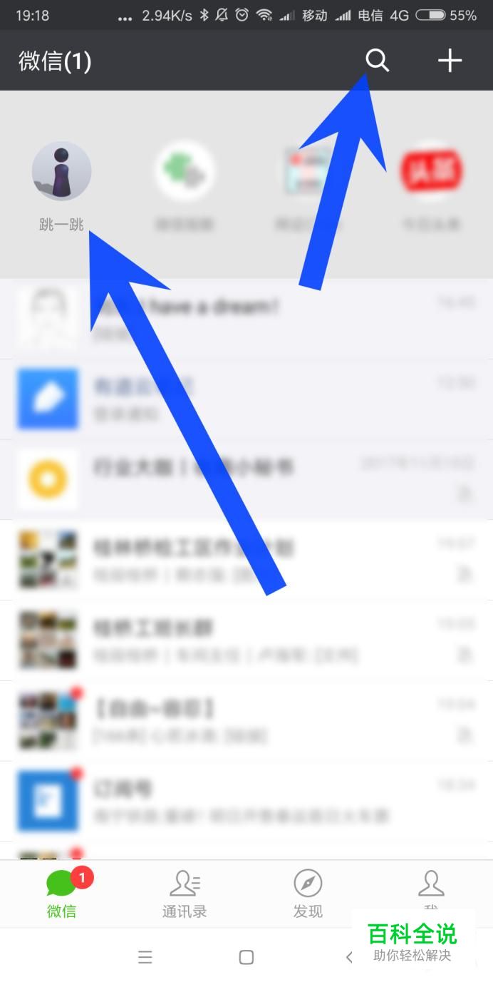 如果我们玩过跳跳这款游戏的话,进入到微信之后,我们在聊天页面往下方滑动,就可以看到跳一跳这款游戏,我们可以打开开始游戏。我是第一次玩的话,我们可以点击上方的搜索图标。