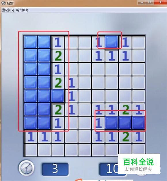 从这二个方块里的数字1(2)可以判断到三个红色标出的方块都不是雷,因为我们刚才标志出来的二个雷,都满足了周边只有一(二)个雷。所以可以点击打开。