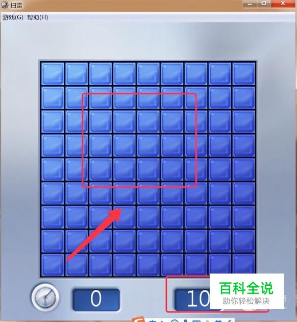 开始游戏后,可以看到右下角的10,代表这里面总共有10个雷,我们要标志出10个雷来,不能点击打开这些雷。 一开始可以随便点击一个方块。