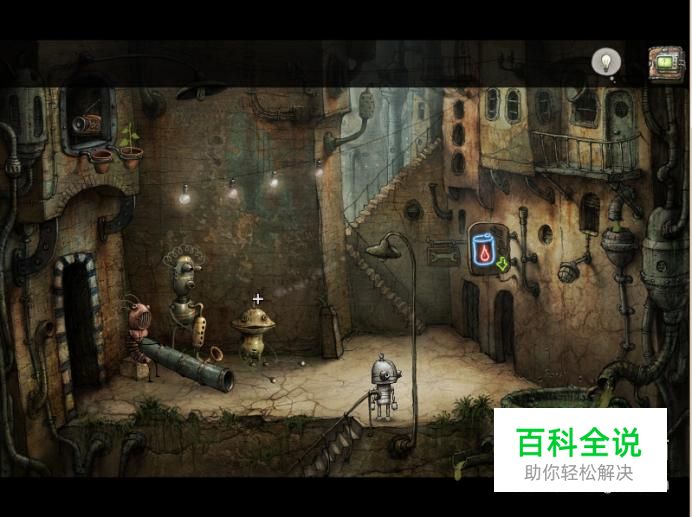 再次进入油吧,将苍蝇放飞到老板的面前并点击一下旁边的油桶。这样我们就会拉着油桶到外面并交个那个打鼓的机器人。音乐再次响起,楼上大妈再次发怒,将另外一个花盆扔了下来。捡起破碎花盆里的那株植物。