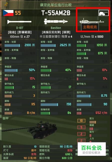 在中消费坦克里,T-55AM2B的炮弹穿深还算不错。强化后的100mm主炮拥有15点穿甲,以及炮弹本身3点爆炸威力,让T-55AM2B能用来对抗敌方的轻甲单位。每分钟8发炮弹的装填速度显得略微有些慢。