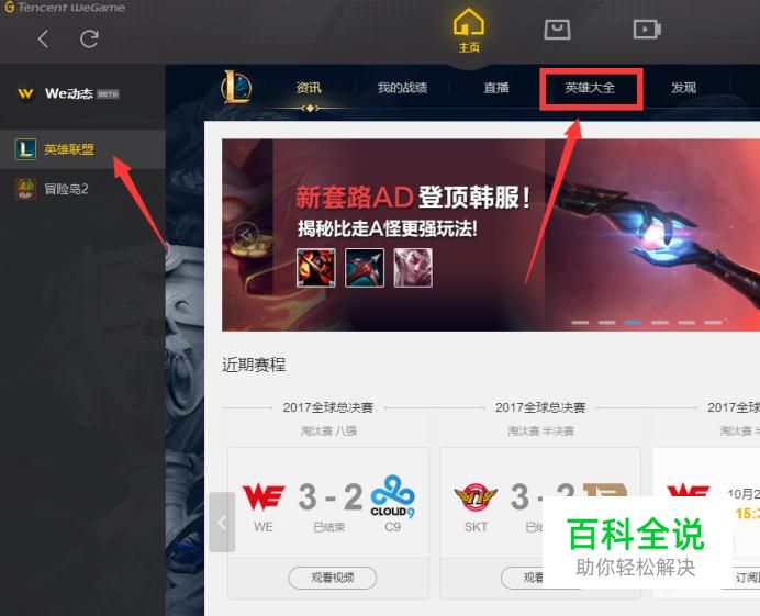 首先我们打开LOL的官方应用wegame,然后打开英雄联盟专区,之后点击菜单中的英雄大全(如图所示)。