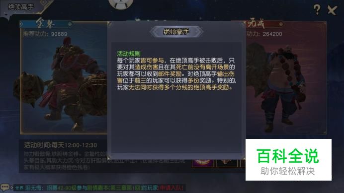 进入绝顶高手活动界面,我们可以看到三个BOSS,每个开启的时间都是不同的,以金鳖为例,点击后查看开启时间为12:00-12:30。