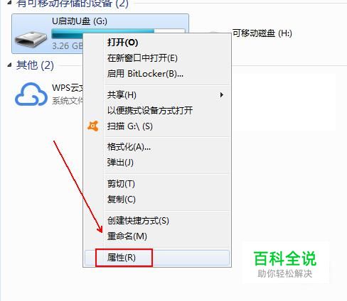 插入U盘后,右击可移动磁盘。在弹出的菜单列表中单击“属性”选项。
