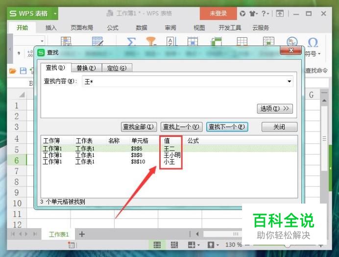 然后点击下方的“查找全部”选项,能够看到显示框中就出现了以王开始的单元格,返回到主界面,效果如下图所示: