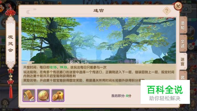弹框进入迷宫活动介绍界面,可查看奖励、积分等信息,点击“参加”,一天只可参加一次。