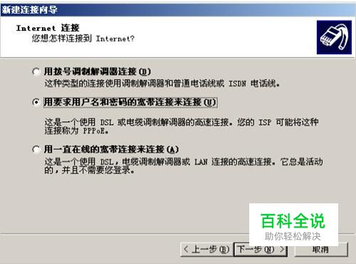 然后我们选择第二个选项即用要求用户名和密码的宽带连接来连接。连接名随便输入。如图所示: