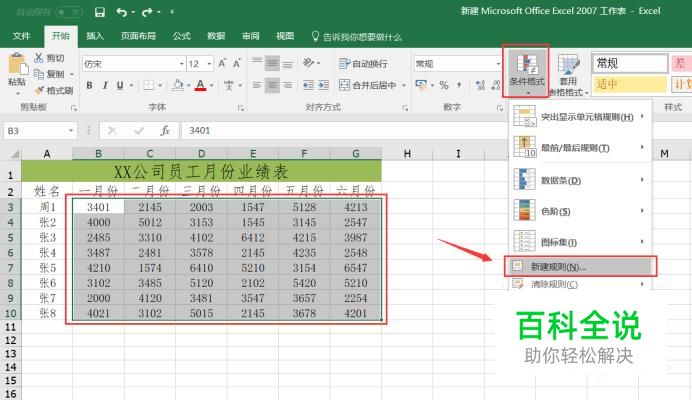 首先选中数字区域,然后选择开始--条件格式--新建规则