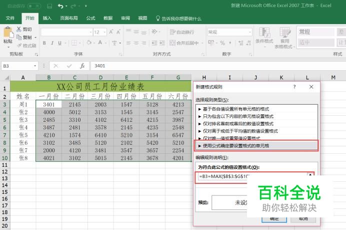 然后在弹出的新建规则对话框中,选择【使用公式确定要设置格式的单元格】后输入公式“=B3=MAX($B$3:$G$10)”,