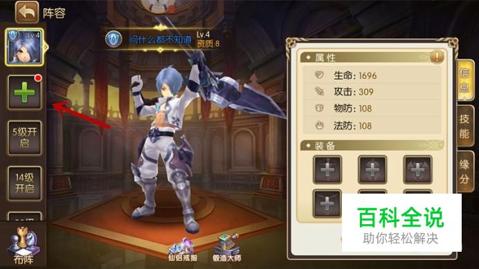 进入阵容界面,我们先对新英雄进行上阵,在左侧列表中点击绿色“+”