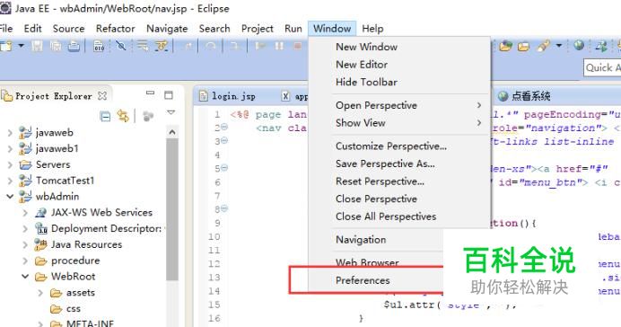 打开eclipse,选择菜单栏中的"window",再选择"preferences" , 操作如下图