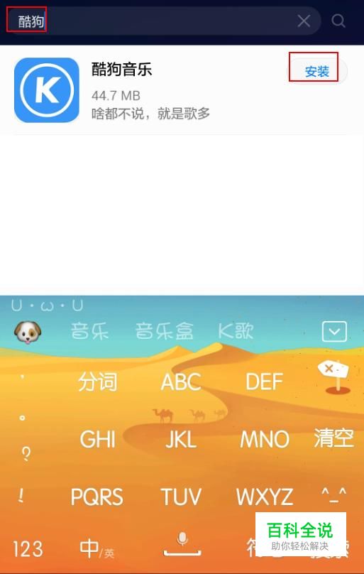 在手机自带的应用市场中搜索“酷狗”,找到“酷狗音乐”并安装。