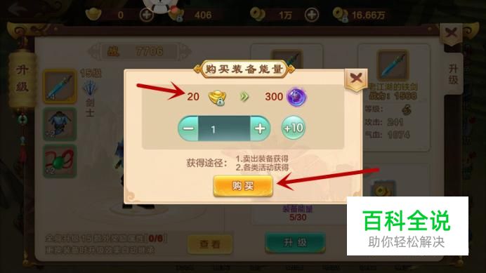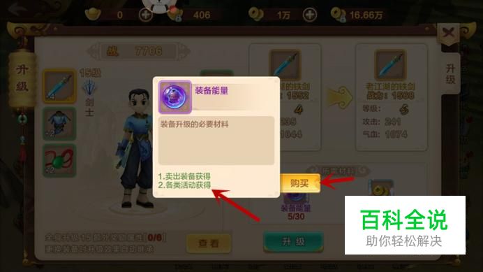 装备能量没有之后将无法进行强化,点击图标可查看活动途径,点击“购买”可以进行购买。