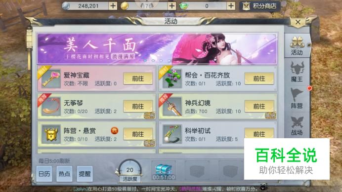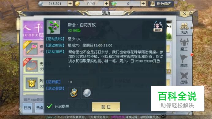 进入游戏主界面,在活动中选择帮会百花齐放前往参与,周末每日可参加1次,完成后获得10点活跃。