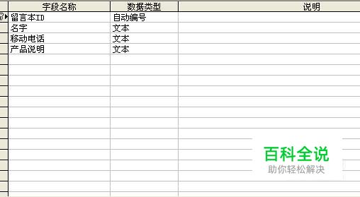 然后输入规划好的字段名称,这里以一个留言本的表来举例。填写,姓名 联系方式 内容 三个表字段项。