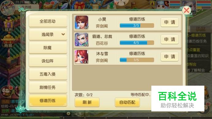 进入组队界面,左侧选择“修道历练”,然后点击“自动匹配”