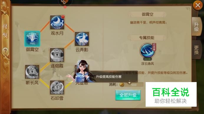 进入技能界面,在左侧点亮的图标就代表已学会的技能,点击“全部升级”来升级技能提高伤害。