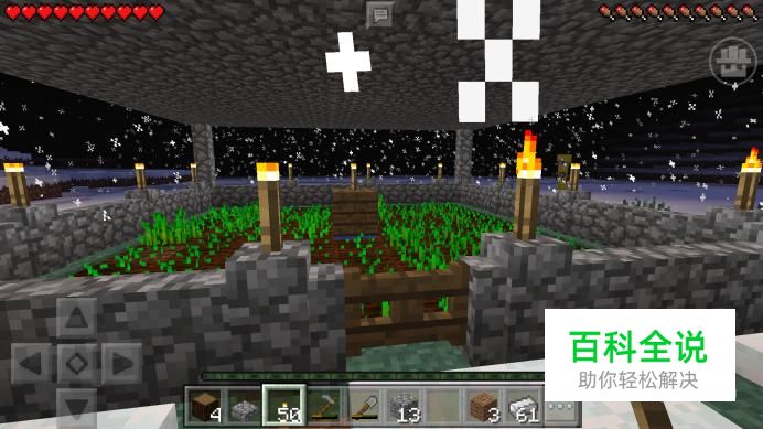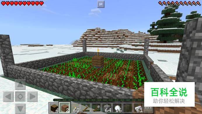 需要注意的是,如果下雪的话,雪层就会覆盖在农田上,使小麦变得不易成熟;因此我们需要在围墙的四角上,分别竖着放两个围墙,这样看起来就像四个石柱子,然后在石柱的上方用石台阶做一个顶棚,避免雪落在小麦地里。