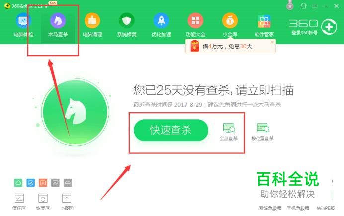 全面杀毒 电脑软件安装较多的时候,可能在安装的过程中了病毒,可以使用杀毒软件对电脑进行全面杀毒操作,如下图所示: