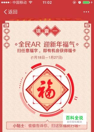AR扫福字 通过支付宝AR红包扫描身边任意福字即有机会获得支付宝万能福。