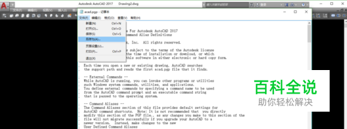 这时会打开acad.pgp文件。因为自定义,会涉及到修改该文件。所以建议先备份。选“文件”-“另存为”。这时,“另存为”选框中就会出现地址,该地址即为acad.pgp的地址。用我的电脑打开该地址,即可找的acad.pgp文件,可进行备份。(当然也可直接另存为。)