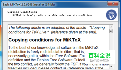第一步,到官网上下载最新的MiKTeX安装包,双击打开进入安装过程,这时直接进入软件协议界面,如下图所示: