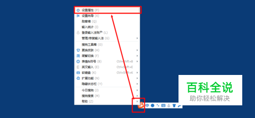 首先在属性设置中进行设置; 右键单击搜狗输入法最左侧的【S】处——选中设置属性;