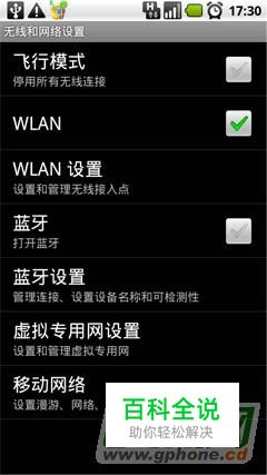 然后在手机里,依次进入 设置—无线和网络。然后勾选上“WLAN”: