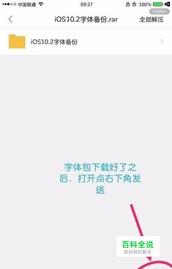 在 iPhone 上下载好需要的字体,然后找到对应的文件包并打开,然后点击发送,如下图。
