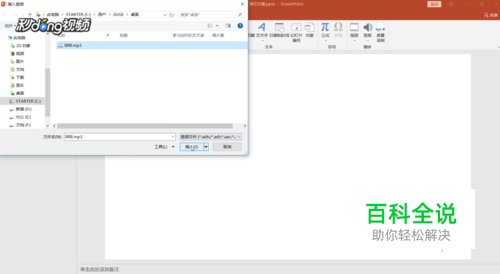 在弹出的对话框中选择一个音频添加,在幻灯片中会出现一个喇叭图案,即表示添加成功。