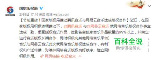 一、强有力的推动 若要共享彼此的音乐资源,QQ音乐应该是不愿意的,毕竟手中的资源量大,但是有国家版权局的推动,估计腾讯撑不住这么大的压力。并且共享作品数量达到99%以上,还要进行长期合作,让我们拭目以待吧。