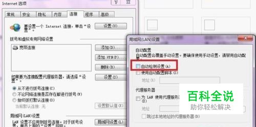 依次选"连接"--"局域网设置",然后把“自动检测设置”的勾去掉。