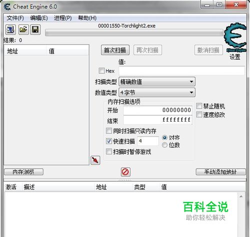 随便一个版本的CheatEngine,我这里是汉化版的,英文版的也差不多,只是显示的是英文,游戏以火炬之光2为例,我们先打开CheatEngine,运行火炬之光2,进入游戏创建一个角色