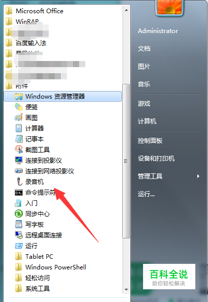 打开电脑左下角开始菜单,然后【所有程序】---【附件】,找到【命令提示符】点击打开。