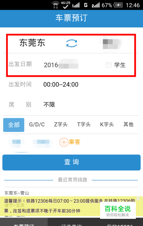 打开12306手机客户端, 输入出发地和目的地,选择出行时间,然后点击“查询”。